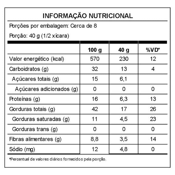 ALÉRGICOS: CONTÉM AMÊNDOAS, CASTANHA DE CAJU, CASTANHA DO PARÁ E DERIVADOS DE AMENDOIM. PODE CONTER PECÃ, AVELÃ, PISTACHE, AVEIA, CENTEIO, CEVADA, TRIGO E SOJA.