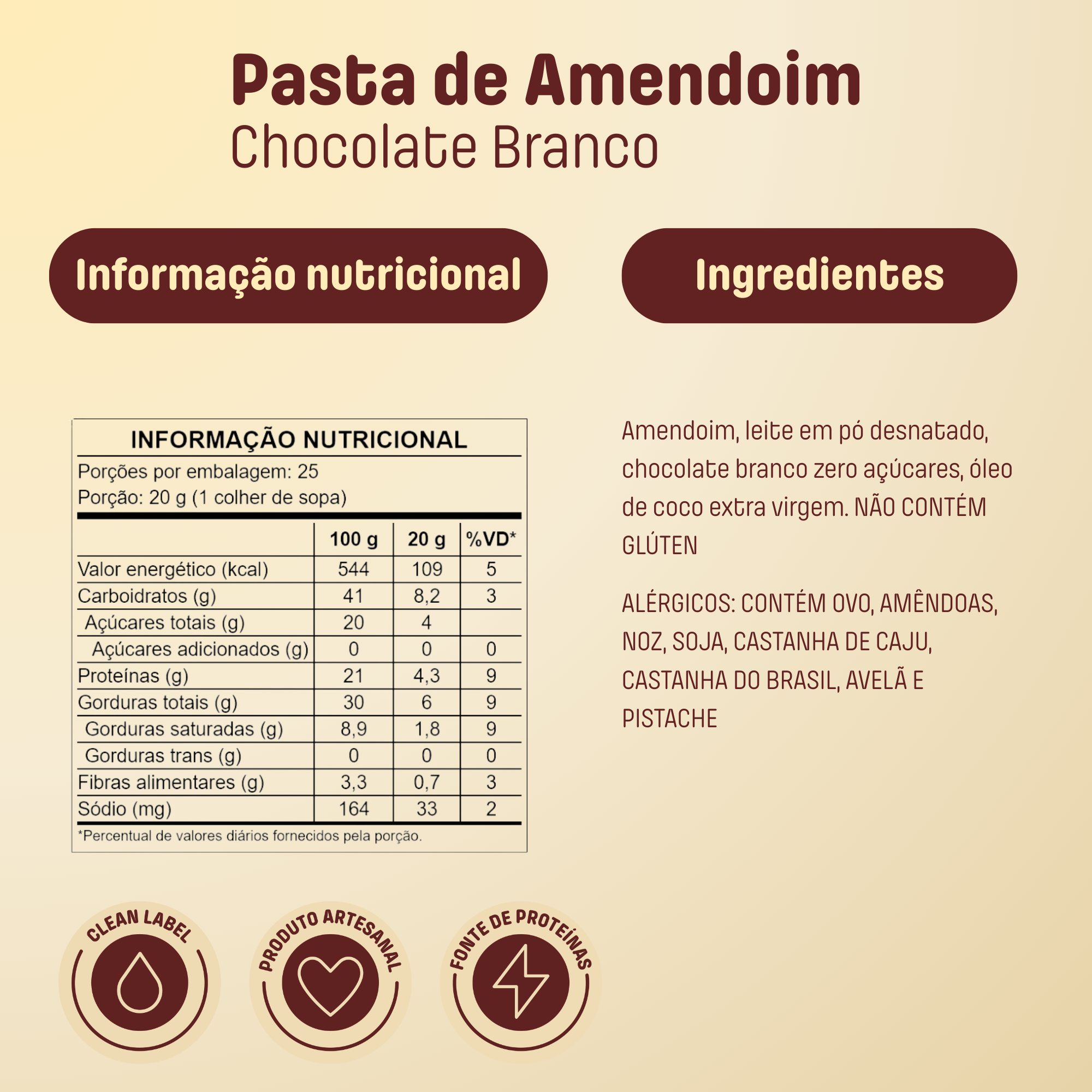 Amendoim, leite em pó desnatado, chocolate branco zero açúcares, óleo de coco extra virgem.